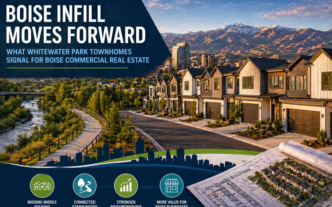 Tags: #boisecommercialrealestate, #boisedevelopment, #boisehousingmarket, #infilldevelopmentboise, #missingmiddlehousing, #boisetownhomes, #whitewaterparkboise, #boiserealestatetrends, #retailleasingboise, #mixedusedevelopmentboise, #boisepopulationgrowth, #housingaffordabilityboise, #boisezoningchanges, #treasurevalleyrealestate