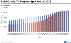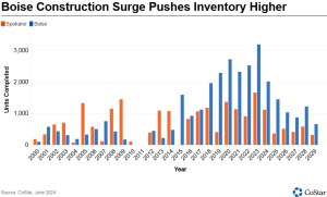 That shift has been most dramatic since the start of 2020. Since then, developers have added more than 12,000 units to Boise’s inventory, a 44% increase. Spokane’s inventory grew by about 6,000 units, an increase of 17% over the same period.
